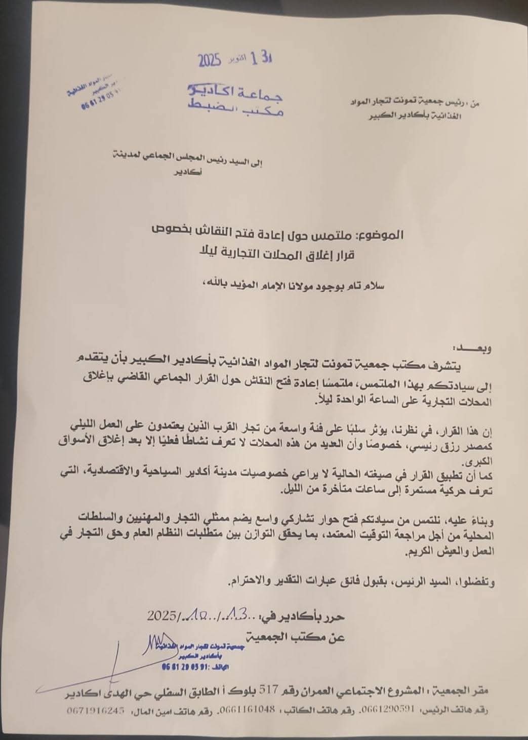 وقد عبّرت الجمعية، من خلال هذه المراسلات، عن قلقها من تداعيات هذا القرار على الأنشطة التجارية، لاسيما في ظل الظروف الاقتصادية الصعبة التي يواجهها التجار، وارتفاع التكاليف، وتراجع القدرة الشرائية للمواطنين. كما شددت على أن توقيت الإغلاق لا ينسجم مع خصوصيات المدينة، التي تعرف دينامية ليلية خاصة خلال فترات الذروة والمواسم السياحية.