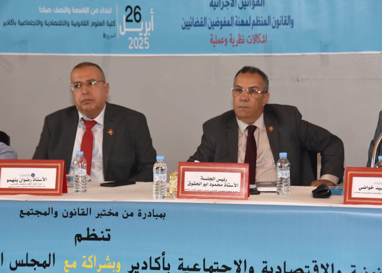 احتضنت رحاب كلية العلوم القانونية والاقتصادية والاجتماعية بأكادير يوم السبت الموافق 26 أبريل 2025، فعاليات ندوة علمية هامة ومثمرة، تمحورت حول موضوع بالغ الأهمية في المشهد القانوني والقضائي المغربي، ألا وهو: “القوانين الإجرائية والقانون المنظم لمهنة المفوضين القضائيين: إشكالات نظرية وعملية”.